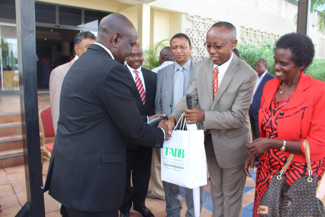 Naibu Waziri wa Kilimo, Mifugo, na Uvuvi, Mhe. William Ole Nasha (Kushoto) akipokea zawadi kutoka kwa Mkurugenzi Mwendeshaji wa Benki ya Maendeleo ya Kilimo Tanzania (TADB), Bw. Thomas Samkyi (Wapili kulia)
